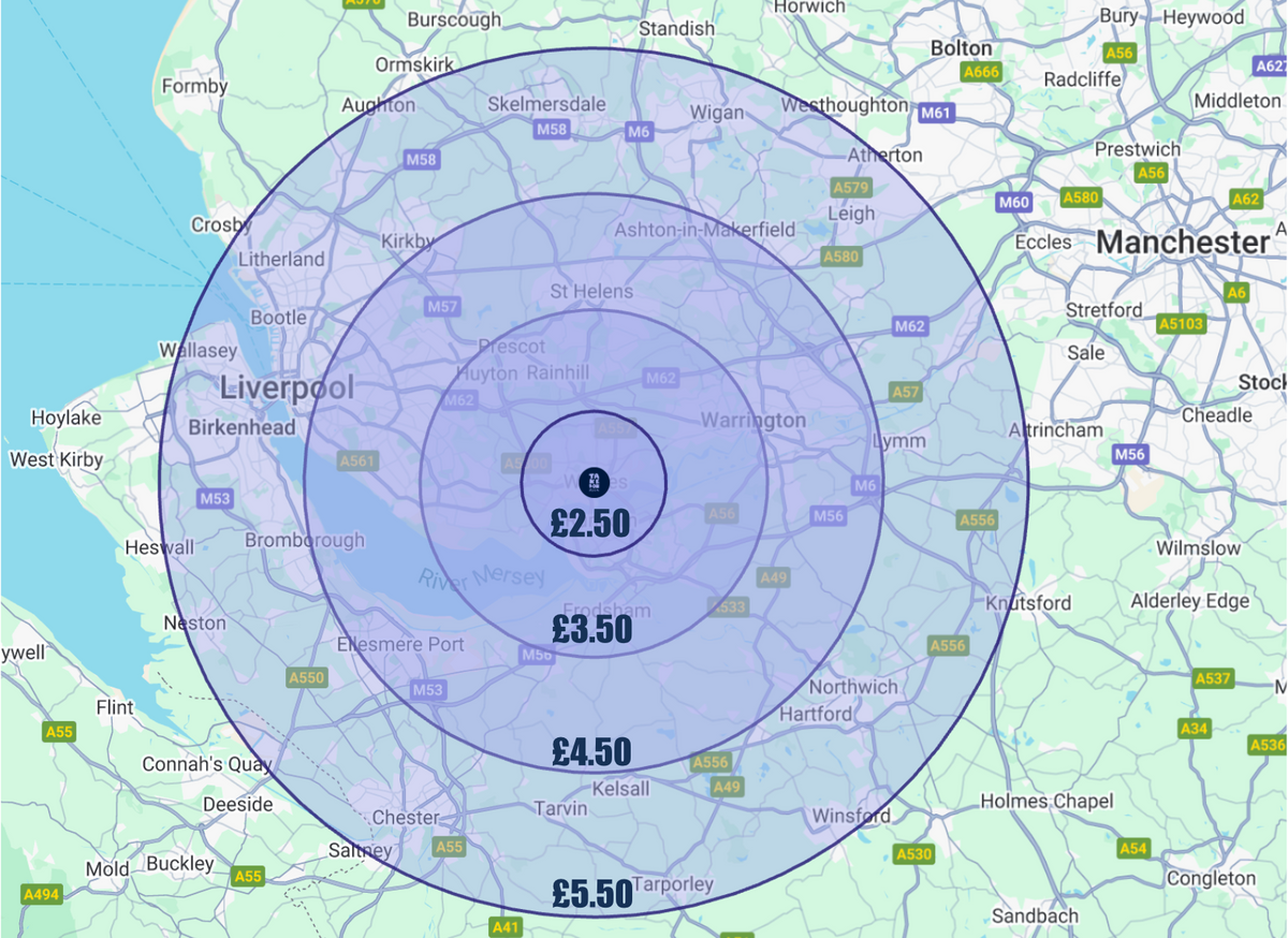 • Up to 2.5 miles: £2.50 (minimum order £30)